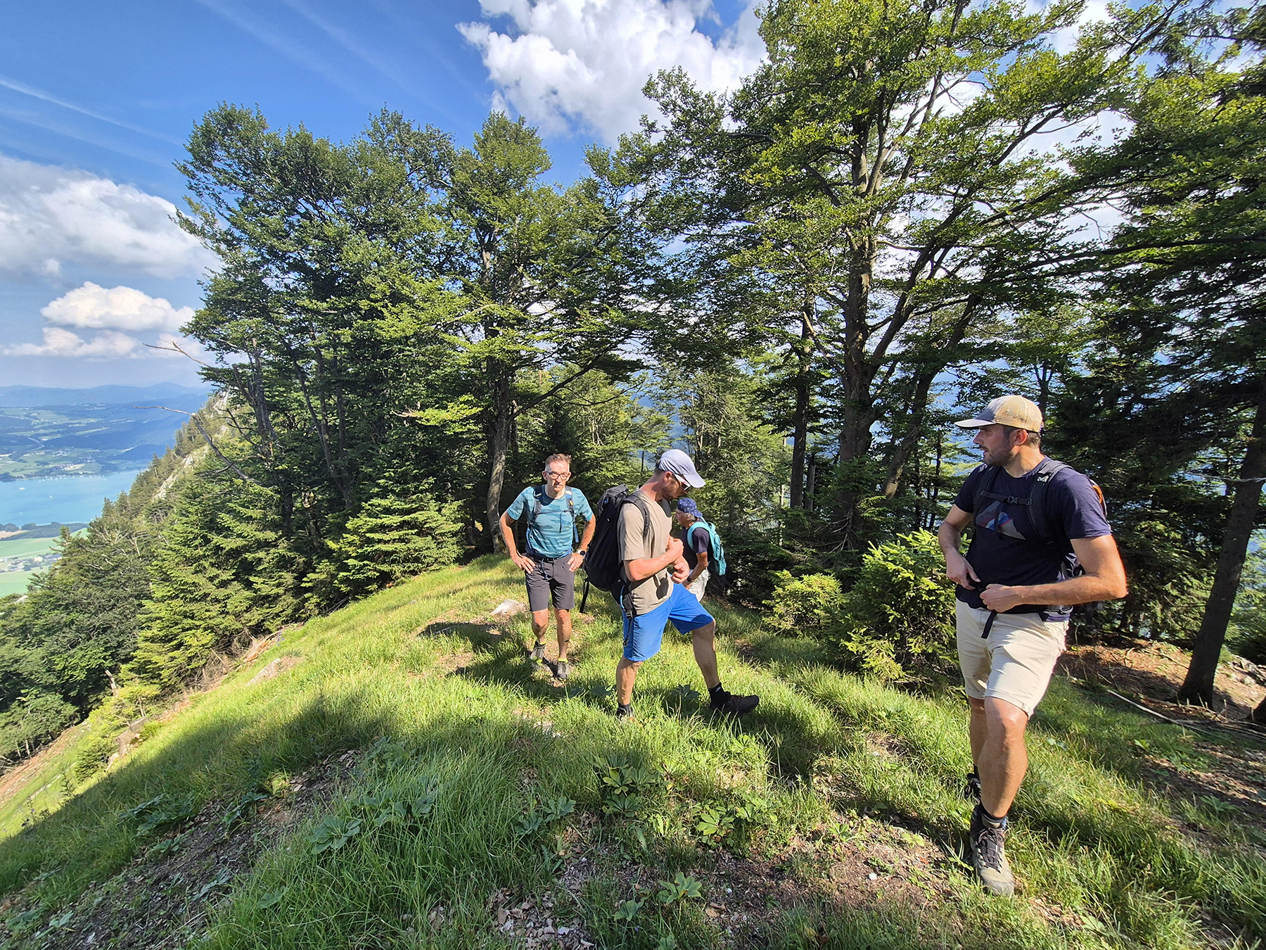 Die 4,5 km lange Tour geht zunächst sanft ansteigend durch den Wald, wobei die Wegfindung das größte Problem darstellt. Nach einem steileren Zwischenteil kommen uns die Schwatzwand und der Grat zum Schober immer näher. Nach leichter Kletterei, rund 500hm und viel Schweiß, dank der schwül warmen Wetterbedingungen, erreichen wir den Schober Gipfel. Frisch gestärkt geht’s zurück zum Parkplatz, wo uns Martin dankenswerterweise mit kühlem Bier versorgt.