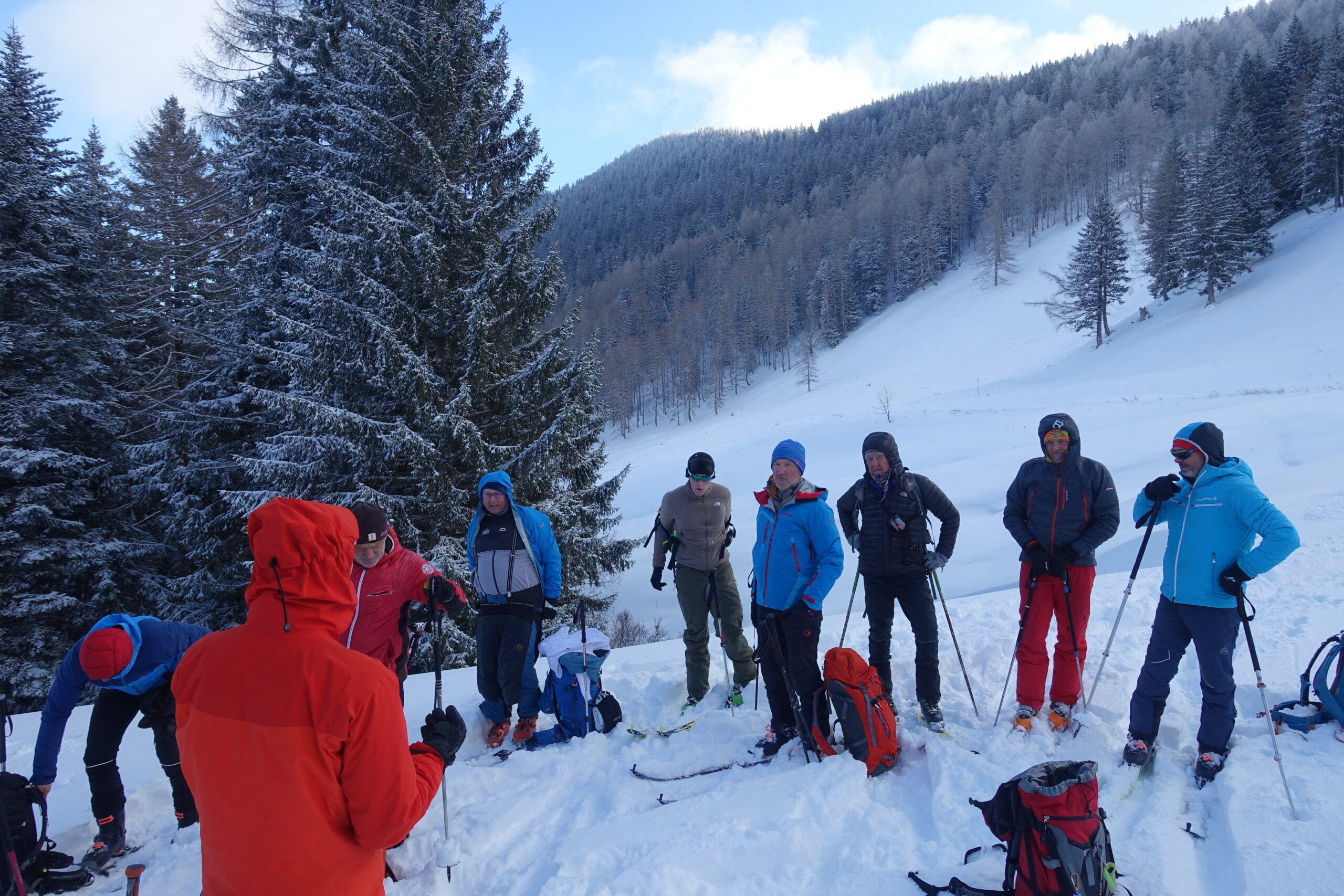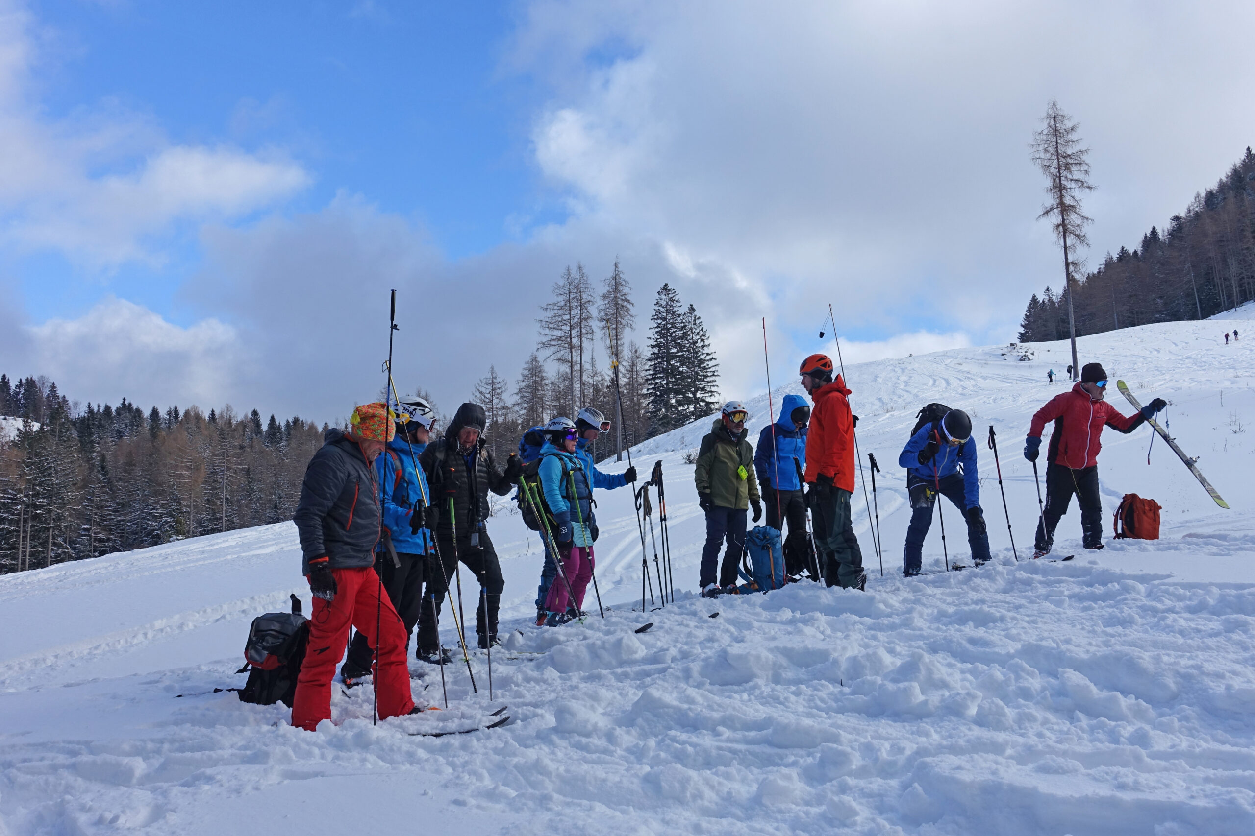 Unter der Leitung von Florian Gnann erfolgte der Anstieg von der Tiefbrunnau mit Tourenausrüstung. Im praktischen Teil wurden zunächst die Reichweiten der LVS-Geräte getestet, bevor intensiv die Verschüttetensuche trainiert wurde. Dabei standen sowohl Einzel- als auch Mehrfachverschüttungen im Fokus, um realistische Einsatzszenarien zu üben.